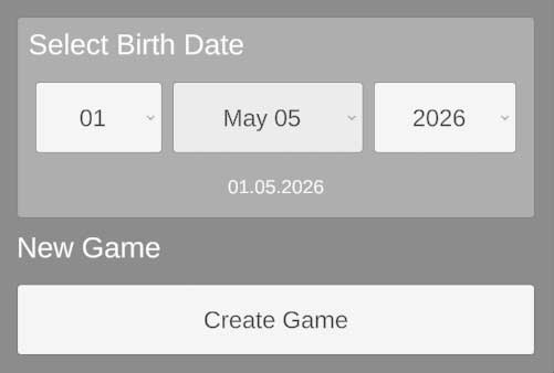 After launching the game, enter the date you are interested in—for example, the day, month, and year of your birth, or any transit date—and click “Create Game”.