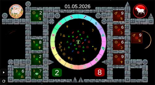 A marble bounces chaotically inside the cosmogram of the natal chart, and each collision triggers the creation of cards. These cards are assigned to two teams: the green (harmonious) team and the red (disharmonious) team.